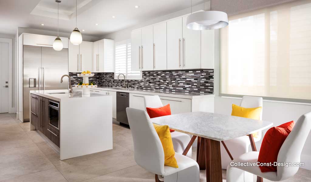 Gloss-white slab-door cabinetry is highlighted by custom horizontal glass and a stainless backsplash. The table is topped by matte Carrera Marble on a butterfly maple base, and flanked by four white side chairs.
