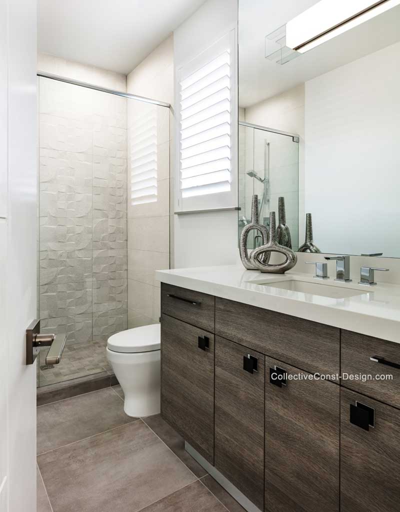 The Guest Bath features textured finishes which are warm and visually pleasing. An LED bath bar mounted atop the mirror illuminates the entire space.