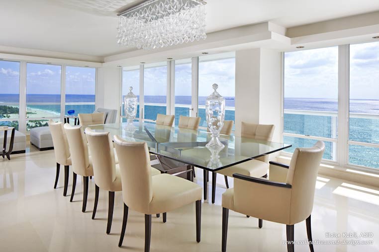 Beachfront Vistas - In the dining area, a hand-blown Murano glass chandelier separates white light into a spectrum of color above a glass-topped table with a Macassar ebony base and satin nickel “XY” arms from Carriage House, and leather-clad “Grefito” dining chairs by Adriana Hoyos. Photography: Kim Sargent