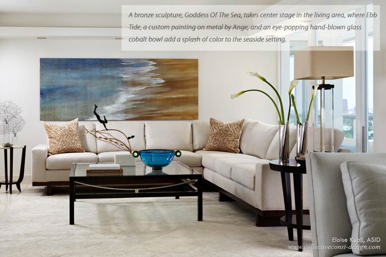 DIEGO AND WILBUR KNEW COMBINING THE TWO UNITS and making one flowing, functional space wouldn’t be easy. Fortunately, they have an architect in the family. “We asked our son-in-law, Clay Krebs, an architect for the firm of Architect, T.A. Krebs LLC, for help,” Diego says. “It was the perfect project for me because I knew exactly how they wanted to use the space,” Krebs says. Walls came down to create one new 4,000-square-foot space. “I used custom designed tray and coffered ceilings with distinctive lighting to delineate space and make each area unique,” Kreb says. “Capturing the views by turning 90-degree vistas into a 180-degree seascape was priority in the design.” Because the building is 30 years old, Krebs decided to update the electrical system to something “just short of a full smart home,” the architect says. Once the space planning was set, the couple commissioned interior designer Eloise Kubli to fulfill their vision. “From the very first moment I met her, I loved working with her,” the owner says. “She understood exactly what I wanted.”