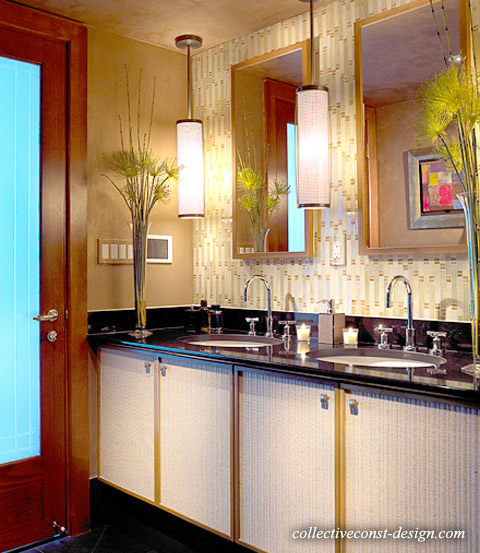 Designer Eloise Kubli, ASID, used iridescent glass tile, LusterStone wall finishes and candlelight to create a sense of Asian mystery within a small space. continued