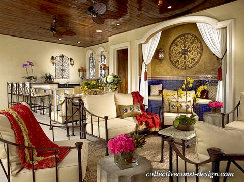 previous European influences, such as the hand-painted tiles of the summer kitchen and the traditional Moroccan glazed terra cotta bench tiles, are prevalent throughout this outdoor patio designed by Eloise Kubli, ASID, thus complementing the Mediterranean-style architecture of the home. ■