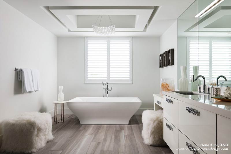 Master Bath - Beautiful architecture and grey porcelain wood flooring are seen throughout the en suite master bath. Blown-glass pendant lighting, white sheepskin cushions, and wood and plaster wall plaques add texture and imbue the space with elements of a luxe home spa. Richelieu chrome bubble hardware adds character to the white cabinetry.