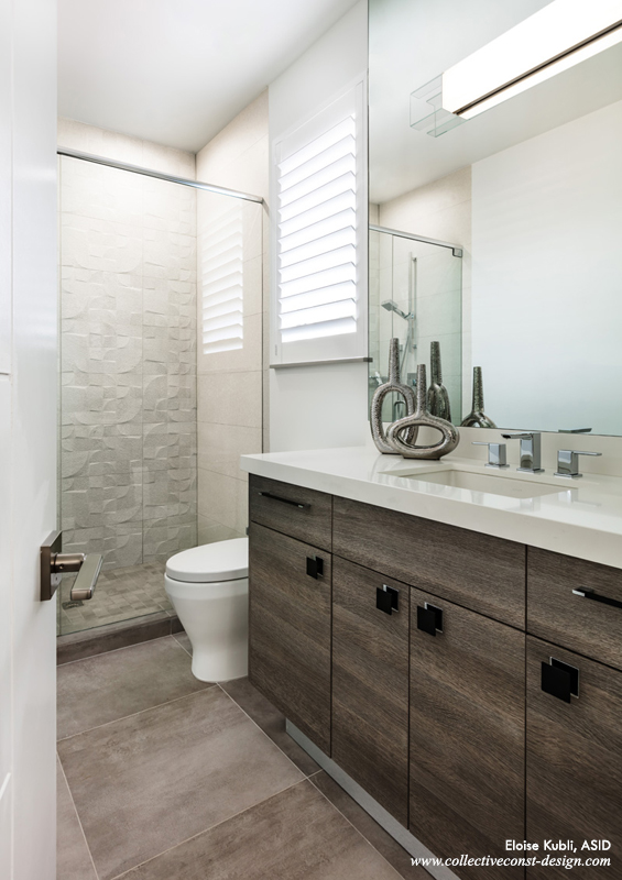 Guest Bath - The Guest Bath features textured finishes which are warm and visually pleasing. An LED bath bar mounted atop the mirror illuminates the entire space.