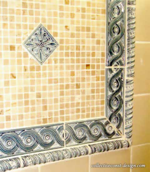 Glass tiles have an iridescent appearance that gives a room a subtle gleam. Here, glass tiles with a glass center accent are coupled with two glass borders surrounded by glazed ceramic tile.