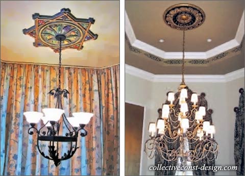 Left: This star-shaped medallion with a fruit motif could dress up a kitchen ceiling. Right: A medallion adds interest to the ceiling and provides an attractive backdrop for a chandelier.
