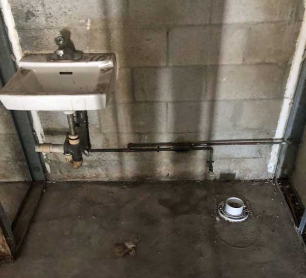 Downstairs Bath - Going towards the back right the downstairs bath has a floating vanity lit from below and holding a concrete sink. The black textured tile contrasts with the copper/grey porcelain tile on the adjacent wall. And what would a man cave be without a urinal?!