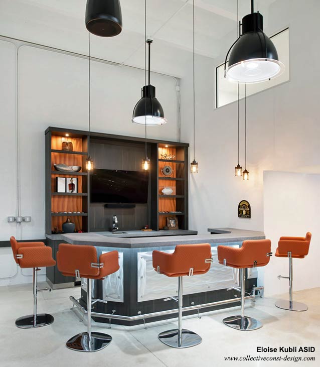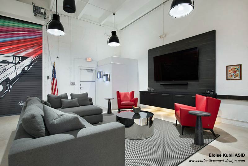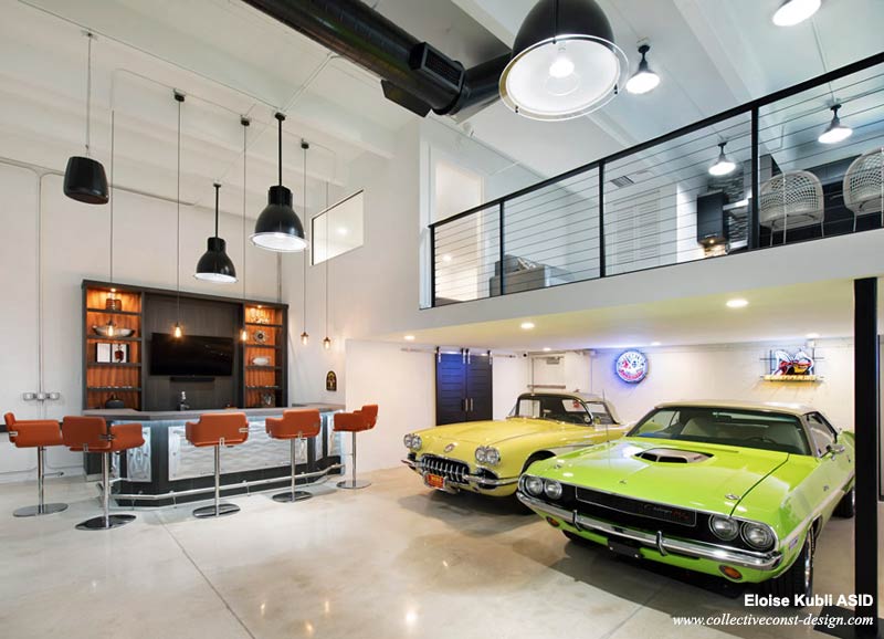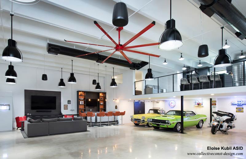Transforming a vacant warehouse into a dream retreat for a classic car and motorcycle collector was a major challenge. “We transformed an unimproved space without utilities into a dream retreat for my client,” said designer Eloise Kubli. She and General Contractor Arthur Kubli created a showstopping Man Cave.