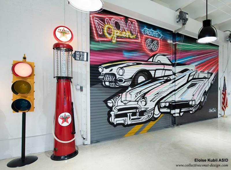 Roll-up Entrance - A custom mural was commissioned and painted on the new hurricane impact roll-up door. The art is a whimsical nod to the owner’s auto collection. A traffic light from from the client’s NY home and the classic gas pump further enhance the past history.