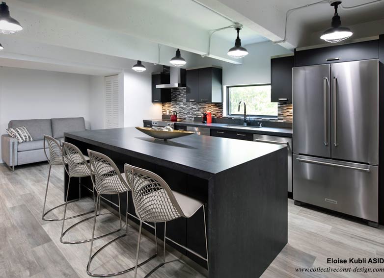 The full kitchen, which offers additional entertaining space, features charcoal grey cabinetry and stainless appliances. A large island has a charcoal base topped with complementary charcoal Caesarstone. Stools from Italy have stainless frames and grey leather seats. A sleeper sofa is covered in grey performance fabric.