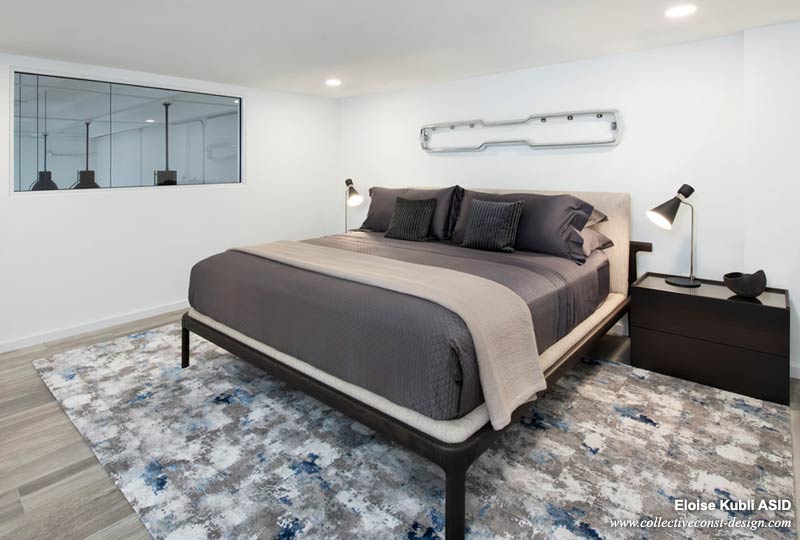 Bedroom - Simple Italian furniture provides a restful bedroom. The room overlooks the lounge and bar area below. Varied 8” and 12” porcelain plank wood look tile runs throughout the main loft area.