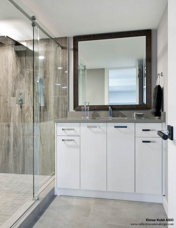 Upstairs Bath - The upstairs bath is a simple organic space in tones of grey. The floor is a simple grey concrete grey porcelain with the shower walls clad in a wood look porcelain.