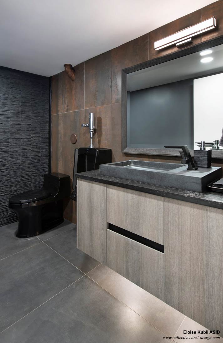 In the first-floor bath, the floating vanity covered in grey Oneskin features a charcoal recessed metal reveal and a Caesarstone charcoal slab countertop. A concrete sink continues the industrial theme. Underneath the vanity, lighting casts a warm glow. Black textural tiles cladding one wall and copper and gray porcelain tiles on another add visual interest to the small space, and contrast with the light, concrete-colored porcelain floor tile. A black urinal visible in the corner announces in no uncertain terms that this is indeed a mancave.