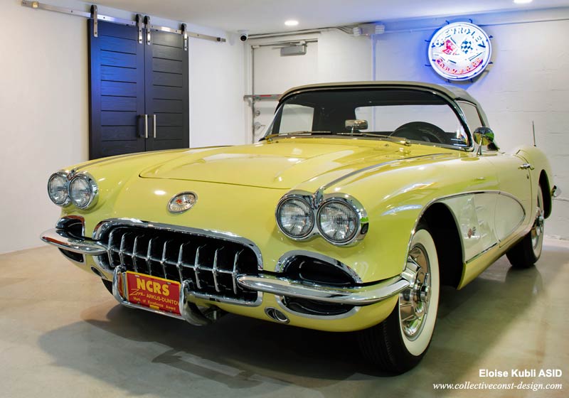 Perhaps the piece de resistance of the automobile collection is a two-toned, 1958 Corvette with the original Panama yellow and white paint. It holds a place of honor next to the bar.