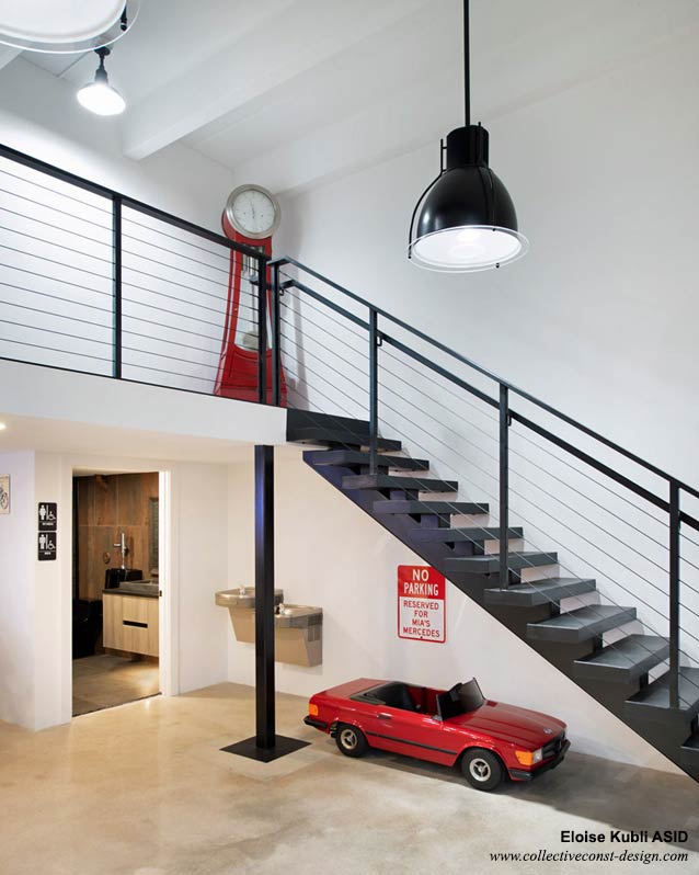 Custom Stairway - Outside the downstairs bath a new stairway leads to the loft/mezzanine area above. Concrete stair treads and black metal with wire railings add a strong architectural detail. Below the stairs the client’s daughter has started her car collection, and has a special place to park.