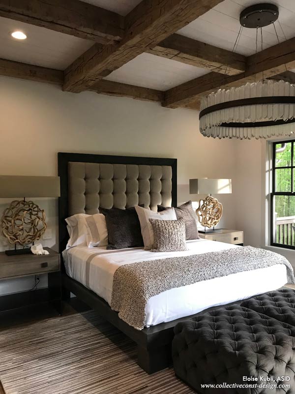 Master Bedroom - Custom iron and wood bed. Headboard upholstery in mohair. Crystal chandelier contrasts with the antique beams.