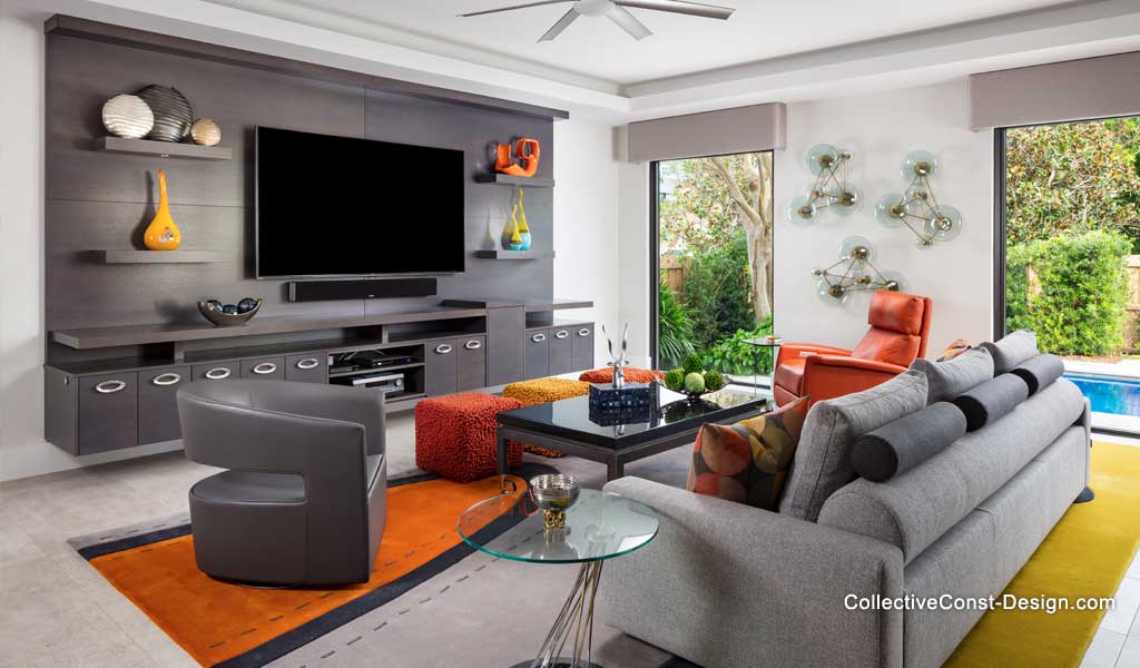 Lit by LEDs above and below, a suspended custom wall unit in riftcut oak holds an 85" TV. Richelieu chrome hardware adds detail. The ten-foot-long custom sofa, graphite grey leather swivel chair, and marigold motorized recliner are anchored by a large 12' x 18' custom wool Della Rubia area rug. The ottomans and side table are from the client’s prior home. Under the cornices, pearl grey sunshades provide sun control and privacy at the touch of a button.