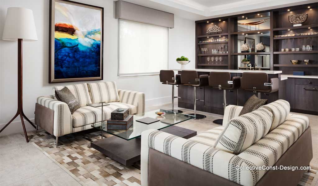 This space features two matching love seats in Otter Ultrasuede, with striped fabric bodies and polished aluminum legs. A pearl-grey wood and suspended-glass custom Italian cocktail table adds a sculptural element. The cowhide rug ties it all together. A large custom bar in grey riftcut oak and grey mirror commands attention for entertainment and display.