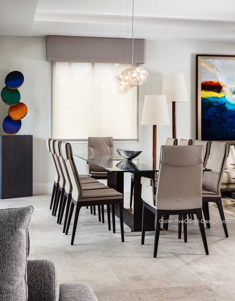 A smoked-oak dining table base supports a double-bevel crystal clear glass top, and is surrounded by eight tall leather side chairs. A colorful metal Coin Toss sculpture is displayed on a custom pedestal. A pair of two-tiered floor lamps connect the Dining Room to the Living Room.
