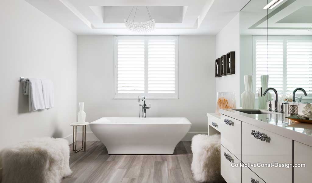 Beautiful architecture and grey porcelain wood flooring are seen throughout the en suite master bath. Blown-glass pendant lighting, white sheepskin cushions, and wood and plaster wall plaques add texture and imbue the space with elements of a luxe home spa. Richelieu chrome bubble hardware adds character to the white cabinetry.