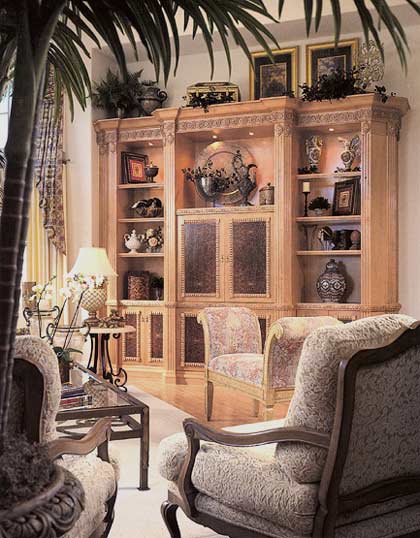 doors open to the foyer, where a hand-carved mirror and a natural-wood console