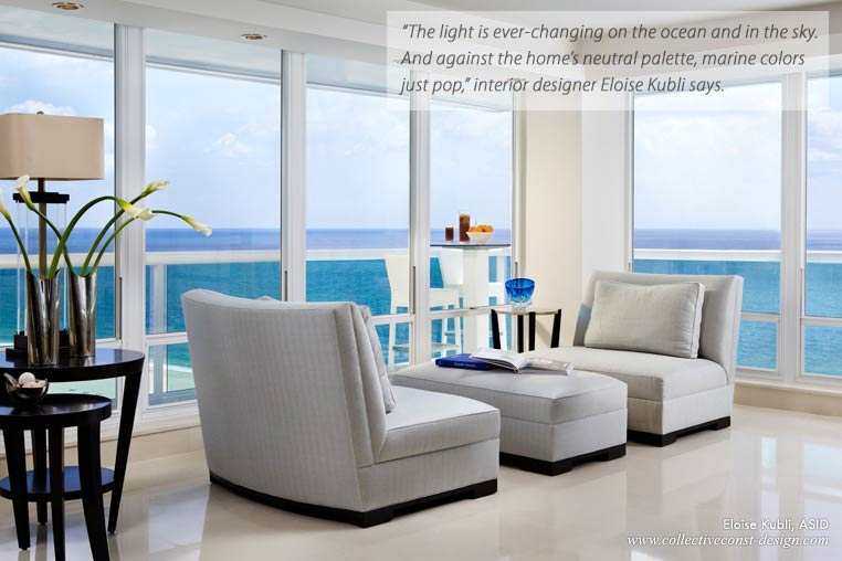 Beachfront Vistas - Clad in a mineral-blue, wave-weave Belgian linen, the “Hugo” chairs and ottoman by Terri Hunzicker from David Sutherland stand out against the pristine views of the sitting area. Here, a cobalt Thorn vase appears to float in midair above yet another linen-topped occasional table by Michael Berman. Photography: Kim Sargent