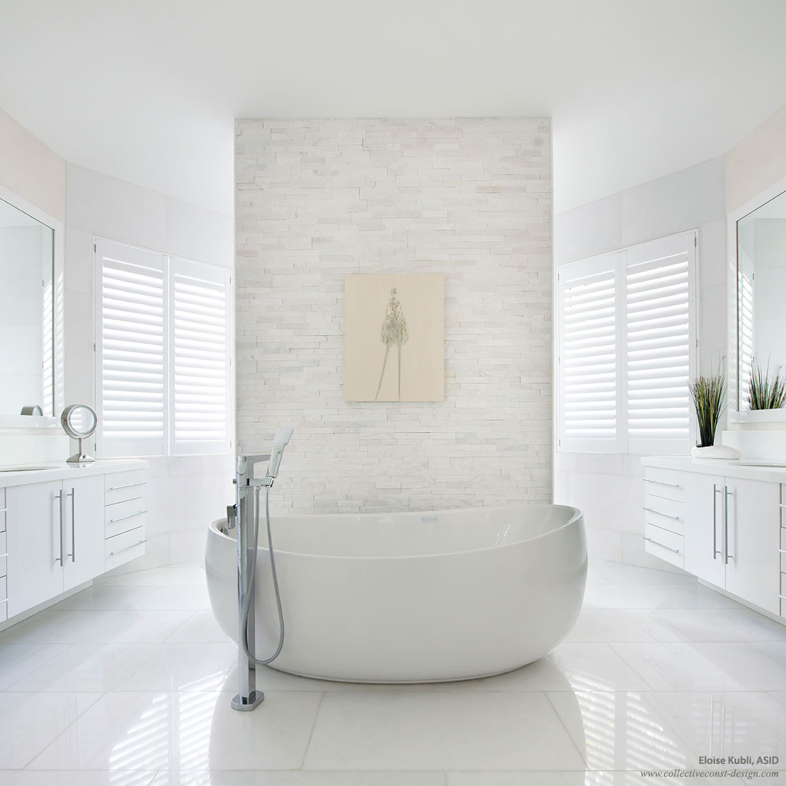 Master Bath - The en suite master bath provides a relaxing sanctuary from the cares of the world. “I created this serene space using a minimalist layout and modern elements that are tranquil and luxe,” said designer Eloise Kubli ASID. A quartz stacked stone wall creates an anchor for this space, and contrasts beautifully with the smooth curves of a luxurious deep soaking tub. Beautifully textured, this construct also serves as a simple yet elegant background for an original work of art.