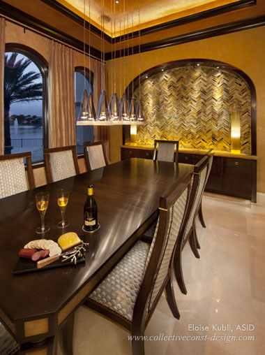 Dining Room - Each piece of glass tile was installed piece by piece to form the herringbone design on the back of the niche wall. The up-lit honey onyx top adds sophisticated drama to the Dining Room.