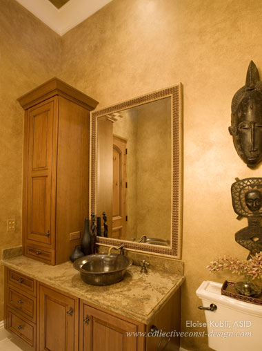 Cabana Bath - The cabana bath, with its unique bronze vessel sink, has texture and authentic ethnic accessories.