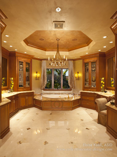 Master Bath - The custom chandelier with is teardrop sandblasted crystals and beads offer a warming glow to the spacious Master Bath. Onyx slabs and insets set the color scheme for the faux paint and Lusterstone walls and ceiling.