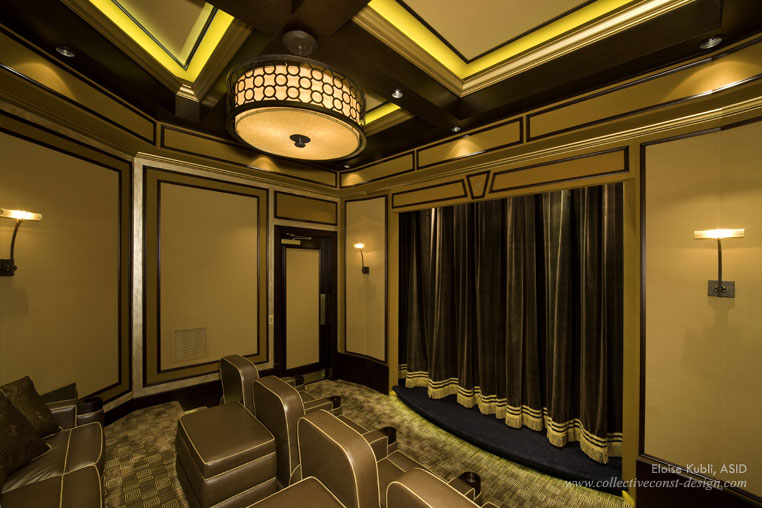 Theater - The Fine Art chandelier adds drama to the Media Room. The back row seating contains a sleeper sofa to allow for overnight guests.