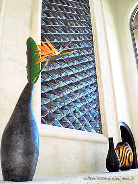 Hand-molded glass tile inserted over the mantle of a stone fireplace creates the image of a wave.