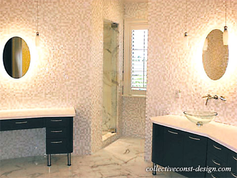 This powder room features mosaic tiles on the countertop and back walls.