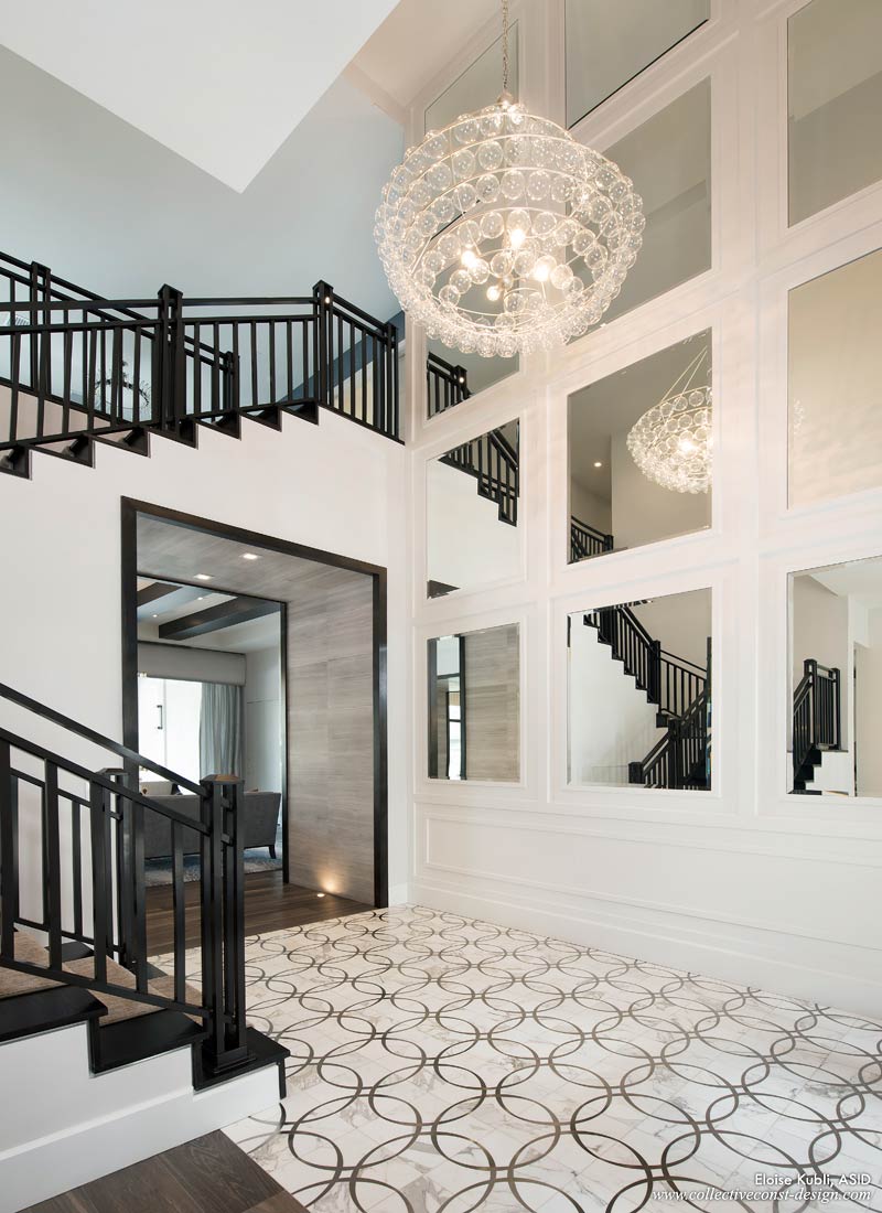 Foyer - Custom Calcutta laser-cut marble with stainless insets greets guests at the entry. A spiraling chandelier illuminates this soaring space.