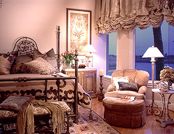 The master bedroom exudes Old World ambiance with furnishings that recall the past, while sumptuous silks and plush fabrics enhance the intimate mood of the room and sitting area.