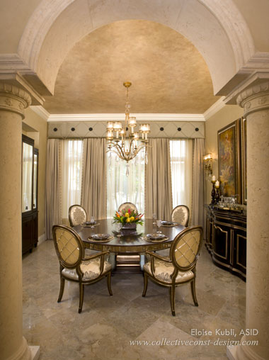 Formal Dining Room - Marble columns frame the round dining table with its mirrored apron, and can comfortably seat eight guests.