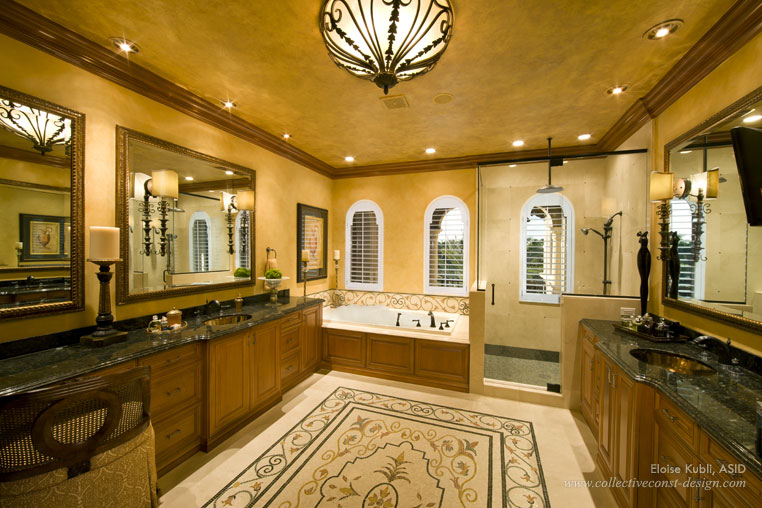 Master Bath - The large hand crafted marble mosaic inset within the marble floor is the focal point of the Master Bath and is repeated on the tub backsplash.