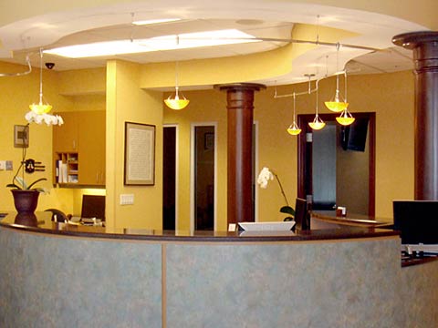 Patients are greeted by an airy, open reception area and a comfortable, spacious waiting room as soon as they walk in the door. Details such as custom halogen lamps and recessed lighting, marble counters, light and dark natural woods and textured walls and floors create the atmosphere of competence and affluence that marks this successful medical practice.