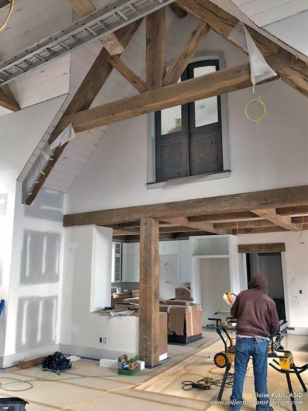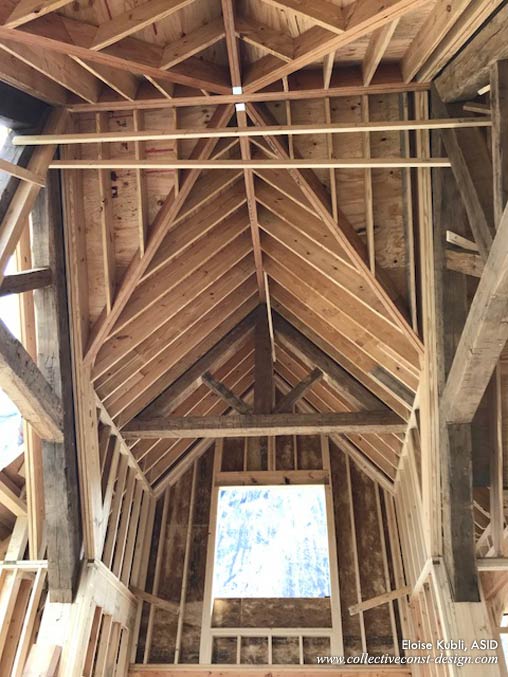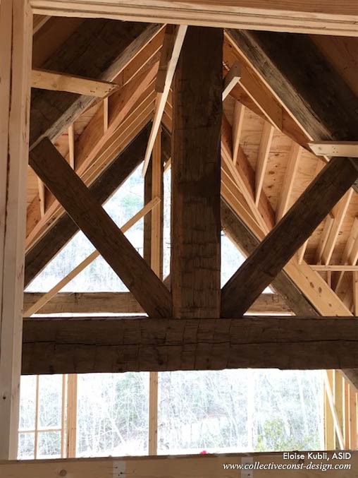 Tavern - One of the home’s massive king posts, framed by an interior window in the second floor tavern.
